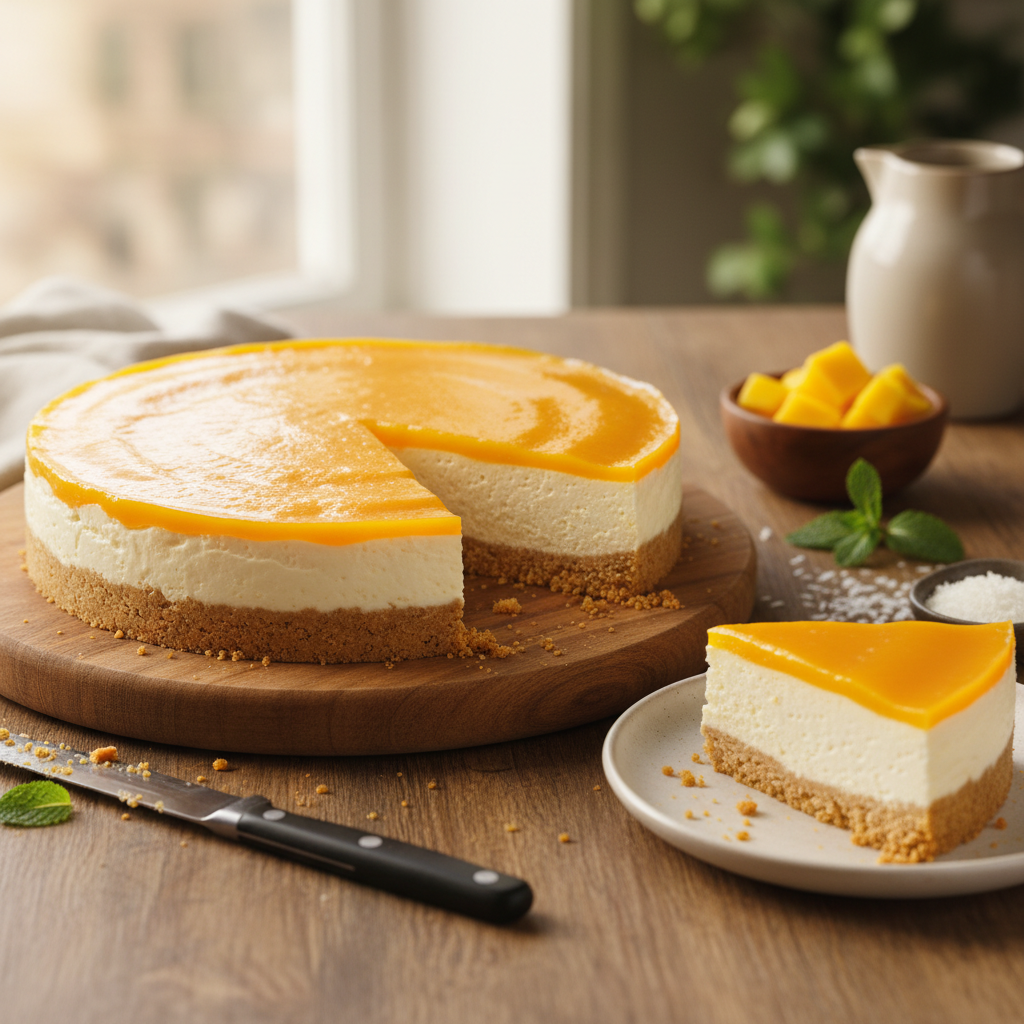 - Mangokatte lisamine: Kui toorjuustukiht on pealt puutekuiv ja kenasti tarretunud, valmista mango-pealiskiht. Paisuta ja sulata katte jaoks mõeldud želatiin sarnaselt varasemale sammule. Sega see toatemperatuuril oleva mangopüree hulka. Vala püreesegu ettevaatlikult ja ühtlaselt koogile ning tõsta magustoit veel vähemalt paariks tunniks, eelistatavalt aga terveks ööks, külmkappi lõplikult settima.